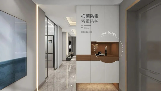 美芯板具有強(qiáng)效抗菌能力和防霉效果,對(duì)金黃色葡萄球菌、大腸桿菌等具有強(qiáng)效抗菌能力,抑菌率>99.99%,且經(jīng)10年老化和洗刷試驗(yàn)后,抑菌率仍能達(dá)到90%以上。